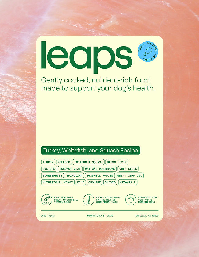 Leaps is a specifically formulated diet for dogs living with cancer. Fuel their fight with our gently cooked, nutrient rich, protein-packed recipes—made to support their immune systems, reduce inflammation, and build muscle.